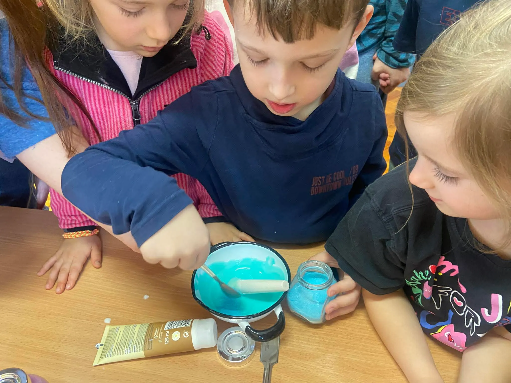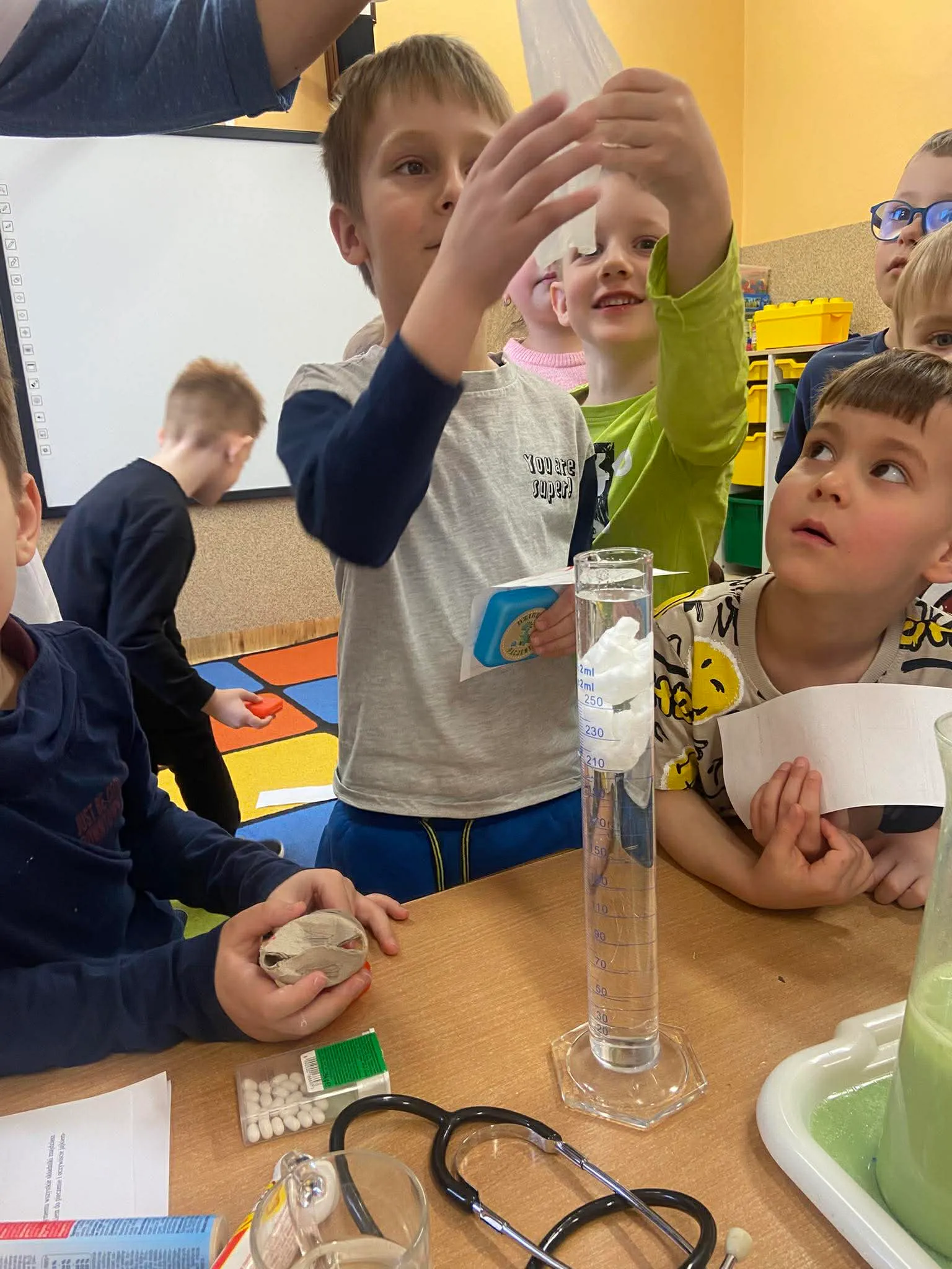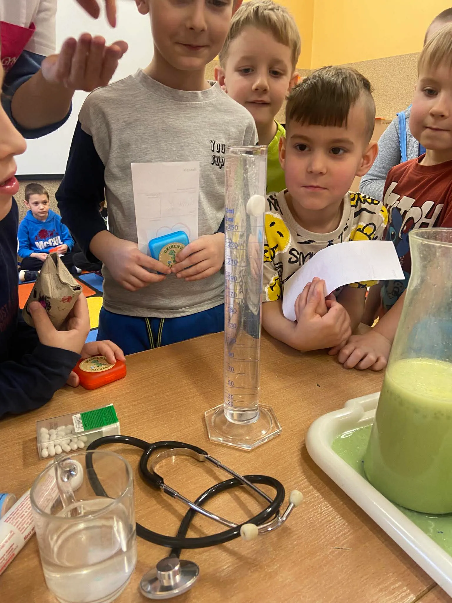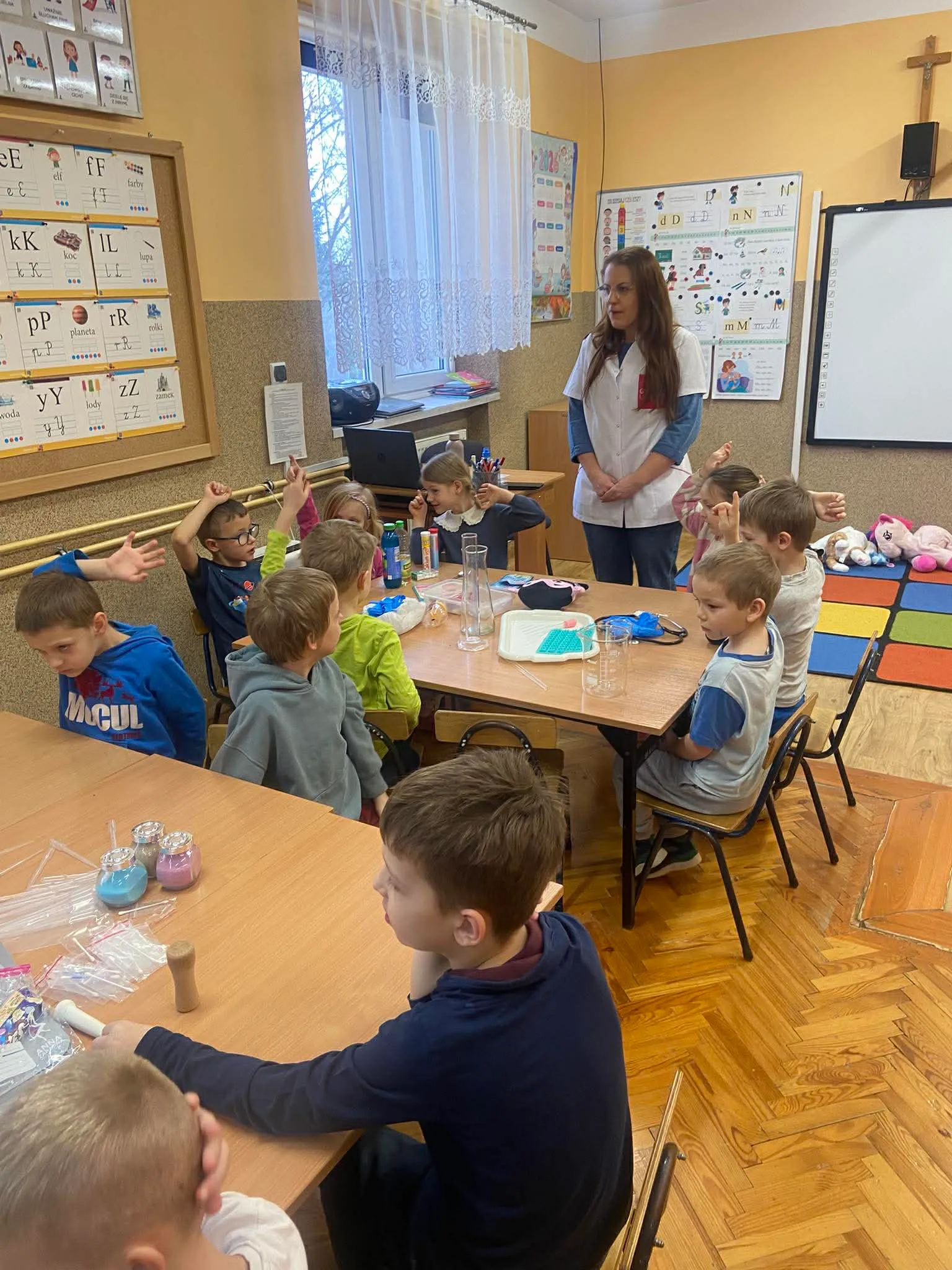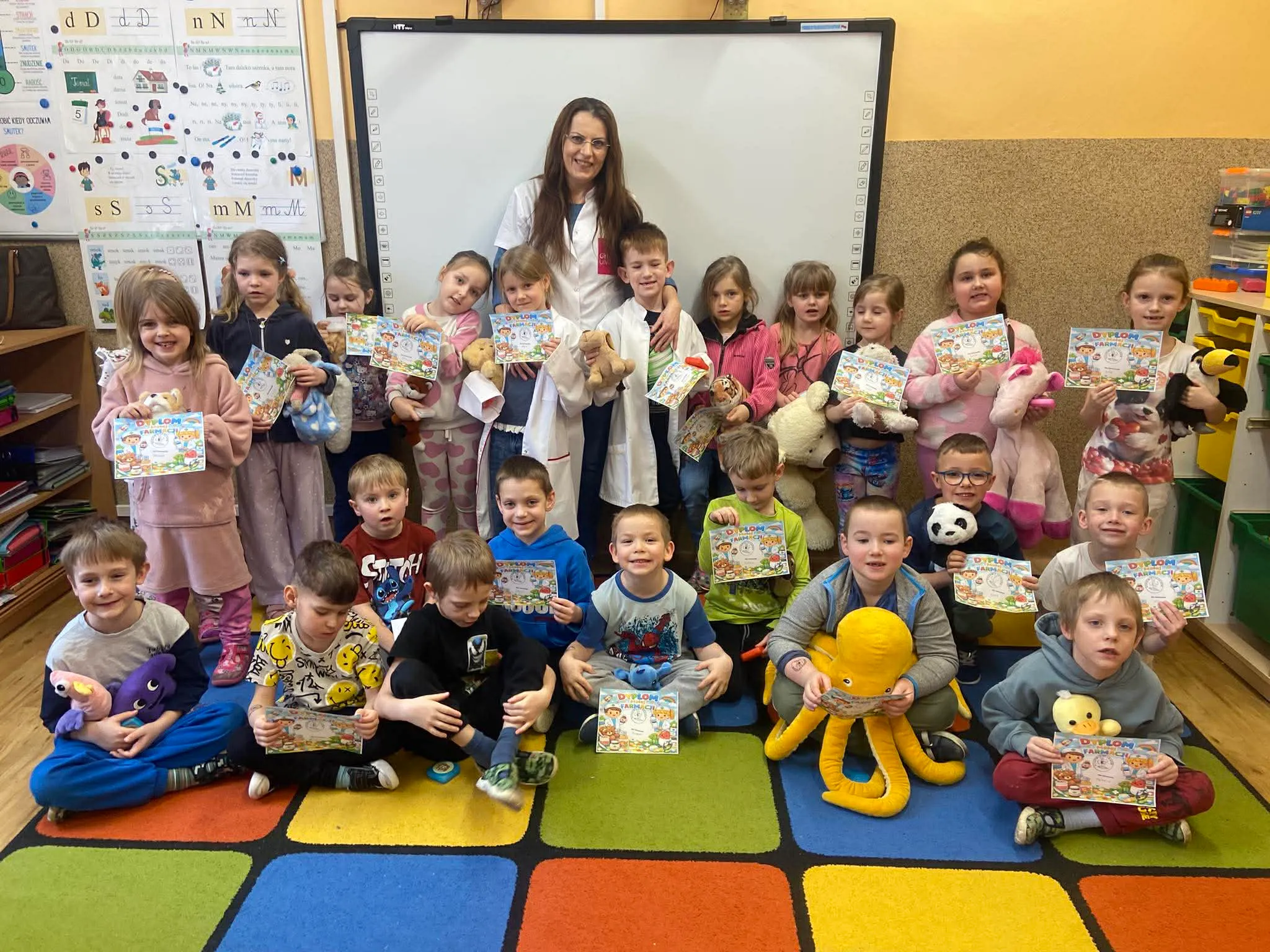 Z wizytą do naszego przedszkola przybyła wspaniała i uśmiechnięta Pani farmaceutka Marta Trafidło, która poprowadziła fantastyczne zajęcia podczas których mieliśmy okazję: pobrać wymaz z noska i zaszczepić pluszaka, wykonać smerfowe żelki, przyrządzić niebieską maść, wyprodukować colowe tabletki oraz zbadać swoje serce. Wielkie zaskoczenie wzbudziło w nas przygotowanie bulgoczącej, wybuchającej mikstury. Mogliśmy również wykonać zdjęcia w fartuchach lekarskich. Zajęcia były ogromnie ciekawe i wzbogaciły naszą wiedzę z farmacji i zdrowia. Dziękujemy serdecznie Pani Marcie za przybycie i cenny czas nam poświęcony, podczas którego wiele się nauczyliśmy oraz za prezenty i piękne dyplomy.